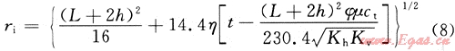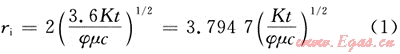石油工業(yè)中國(guó)際上對(duì)于探測(cè)半徑的定義為:在某一確定的瞬時(shí),給井中施加一個(gè)壓力脈沖,對(duì)該脈沖響應(yīng)達(dá)到最大值的位置就稱為探測(cè)半徑。在標(biāo)準(zhǔn)單位制式下,探測(cè)半徑表示為[1]:
