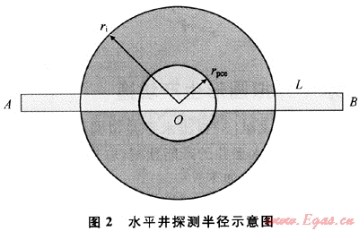 ;利用產(chǎn)量等值原則,將線性水平井段簡(jiǎn)化為擬圓形坑道,應(yīng)該看到中心圓形半徑為rpc=L/4,由于生產(chǎn)坑道空間自身的圓形半徑為h/2。因此圓形坑道的外緣半徑為rpce=(L/4)+(h/2)。從供給邊境至圓形坑道外緣的流動(dòng)為平面徑向流,從擬生產(chǎn)坑道的外緣半徑至生產(chǎn)井底的流動(dòng)為氣層厚度h的空間高度上、垂直并圍繞水平井段的平面徑向流,半徑為氣層高度之半(h/2)。3 水平井探測(cè)半徑的概念