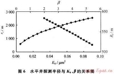 該水平井探測(cè)半徑存在一個(gè)基準(zhǔn)值,即水平井測(cè)試或生產(chǎn)完成垂直平面內(nèi)的徑向流時(shí)的探測(cè)半徑(擬圓形坑道的外緣半徑rpce)以及對(duì)應(yīng)的時(shí)間tpce測(cè)試或生產(chǎn)時(shí)間大于tpce時(shí)即可進(jìn)行計(jì)算。對(duì)于油氣藏儲(chǔ)集空間平面上表現(xiàn)出徑向復(fù)合的非均質(zhì)特征時(shí),可以先對(duì)儲(chǔ)層水平滲透率進(jìn)行平均后再進(jìn)行計(jì)算。實(shí)際計(jì)算結(jié)果表明,水平井探測(cè)半徑隨測(cè)試或生產(chǎn)時(shí)間及儲(chǔ)層滲透率的增大而增大,隨儲(chǔ)層厚度、水平段長(zhǎng)度及各向異性系數(shù)的增大而降低。根據(jù)筆者提出的方法,不僅可以實(shí)時(shí)評(píng)價(jià)水平井的探測(cè)半徑、對(duì)油氣藏的控制程度,還可優(yōu)化水平井油藏工程設(shè)計(jì)、評(píng)價(jià)水平井開(kāi)發(fā)的優(yōu)勢(shì)。
