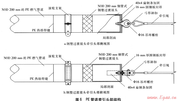 牽引頭部采用與PE管道相同規(guī)格的鋼塑過渡接頭制成,鋼塑過渡接頭的PE管端與NOD 20mm的PE管道熱熔焊接,DN 200mm鋼管端用厚度為16mm、直徑為219mm的圓形鋼蓋板滿焊封閉。鋼蓋板中心開有直徑為20mm的圓孔,事先穿入M16帶肩吊環(huán)螺栓1根(整體式鍛鋼材質(zhì)),鋼蓋板內(nèi)側(cè)用M16雙螺母緊固,吊環(huán)貼附于鋼蓋板外側(cè)。吊環(huán)圓孔內(nèi)、外徑分別為48、80mm,其底部與鋼蓋板通過焊接連為一體。吊環(huán)兩側(cè)各焊接1根規(guī)格為40×4的扁鋼條進行加固,扁鋼條從鋼蓋板表面延伸至鋼塑過渡接頭DN 200mm鋼管端側(cè)面,所有焊縫均為滿焊。