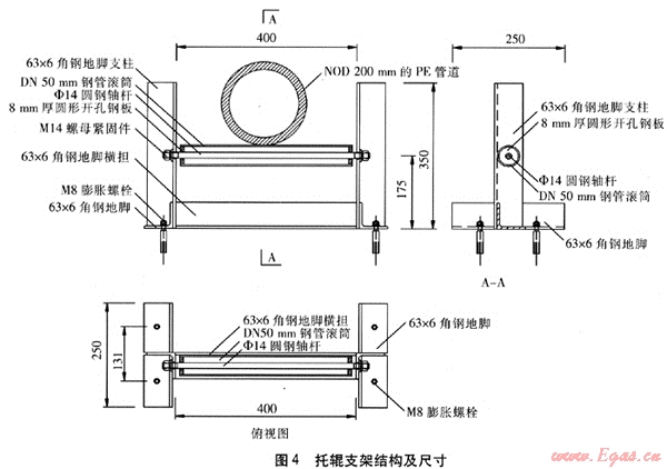 焊接完畢的待穿管PE管道,應每隔5m設(shè)1組托輥支架對其進行支撐。穿管作業(yè)時,前行的PE管道帶動滾筒圍繞軸桿轉(zhuǎn)動,接觸面呈滾動摩擦狀態(tài),一方面可防止PE管道被地表硬物劃傷,另一方面可減小穿管時的摩擦阻力,加快穿管作業(yè)進度,使PE管道沿預設(shè)的線路前進,不致于產(chǎn)生過大的偏移。托輥支架的結(jié)構(gòu)及尺寸見圖4。