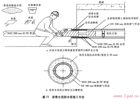 由于套管內(nèi)NOD 250mm的PE短管、楔條的支承作用,由瀝青油麻、瀝青水泥組成的柔性防水層不會因PE燃氣管道自身重力、回填土的壓力而發(fā)生變形、破壞,確保其防水性能。