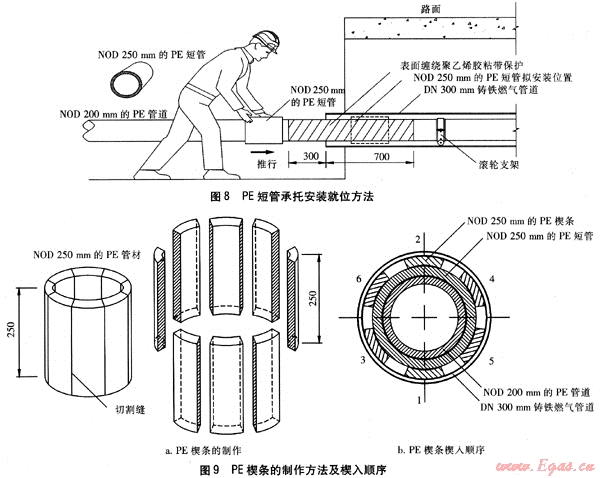 ② 如圖8所示,在NOD 200mm的PE管道上套入一截長度為300mm的NOD 250mm的PE短管(PE80、SDR11),并將其置于套管內(nèi);由于NOD 250mm的PE短管的內(nèi)徑比NOD 200mm的PE燃氣管道的外徑略大,適合用作對NOD 200mm的PE燃氣管道進行限位、支承的承托。NOD 250mm的PE短管外側(cè)與套管端口的水平凈距為200mm,作為柔性防水層封堵的預留空間。