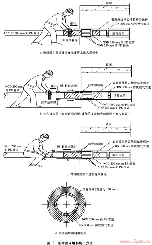 ④ 瀝青油麻填料一般分2次填塞,以確保其密實度,具體做法見圖12。將直徑為30mm的油麻繩用環(huán)氧煤瀝青漆浸泡15min后取出,均勻纏繞在NOD 200mm的PE燃氣管道上(PE管道表面事先纏繞1層聚乙烯膠粘帶保護,搭接寬度為膠粘帶寬度的50%,纏繞長度為1000mm),待形成寬度約80mm,外徑約300mm的盤狀繩圈后,將瀝青油麻繩推入套管內(nèi)的空隙內(nèi),用直徑為20mm、一端為光圓鈍頭的鋼筋釬棒均勻搗實瀝青油麻繩,并使之緊貼于NOD 250mm的PE短管承托的外側(cè)端面上。按同樣要求纏繞、搗實第2盤瀝青油麻繩,瀝青油麻填料的最終寬度為150mm。
