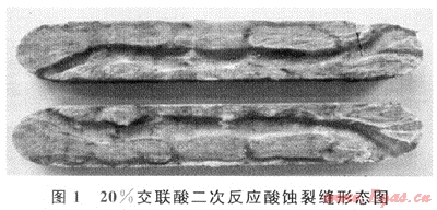 試驗(yàn)結(jié)果表明,20%膠凝酸鮮酸能得到一定的導(dǎo)流能力,10%膠凝酸(模擬殘酸)導(dǎo)流能力遠(yuǎn)遠(yuǎn)低于鮮酸,說明酸液進(jìn)入裂縫的深部刻蝕能力降低,試驗(yàn)3與試驗(yàn)1相比,說明閉合酸化能顯著提高裂縫導(dǎo)流能力。二次試驗(yàn)后平行板巖心的酸蝕溶孔道更為明顯,而且酸蝕孔道的深度更深,具有更高的導(dǎo)流能力(圖1)。說明采用高黏度的交聯(lián)酸,無需進(jìn)行閉合酸化和多級(jí)注入工藝就可以獲得高的導(dǎo)流能力,而且由于酸巖反應(yīng)慢,活性酸能進(jìn)入地層深部,是進(jìn)行碳酸鹽巖地層深部改造的理想酸液體系。