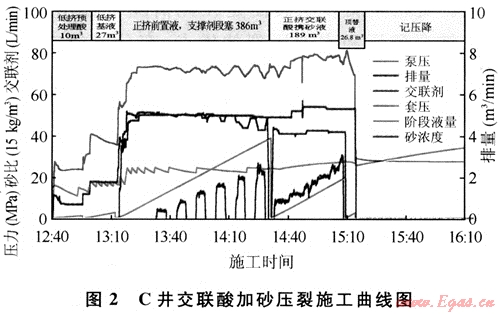 C井的交聯(lián)酸加砂壓裂是國(guó)內(nèi)外首次在井深超過5000m、溫度高于140℃地層中成功實(shí)現(xiàn)真正的交聯(lián)酸加砂施工,為碳酸鹽巖的儲(chǔ)層改造開拓了新的、更廣闊的途徑,在碳酸鹽巖改造工藝突破的歷史進(jìn)程中具有里程碑的意義。