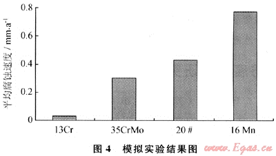 雅克拉氣田、大澇壩氣田管道材料為16Mn、20號(hào)鋼,材料耐蝕性能差。在模擬雅克拉氣田介質(zhì)條件下,對(duì)20號(hào)鋼、16Mn等4種材料進(jìn)行了實(shí)驗(yàn)評(píng)價(jià),實(shí)驗(yàn)結(jié)果見圖4[7]。