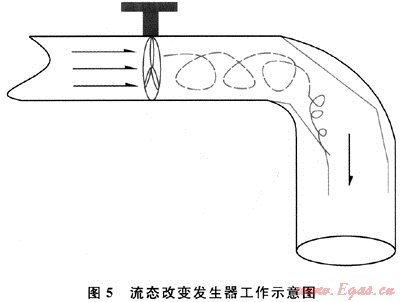 2) 可考慮在彎管前增加流體流態(tài)改變發(fā)生器。由圖2可知,在彎管內(nèi)壁外側(cè)后段和內(nèi)壁內(nèi)側(cè)前段易形成湍流,產(chǎn)生空泡腐蝕。因此,可在流體進(jìn)入彎管前增加一個(gè)流體流態(tài)改變裝置,預(yù)先給流體增加一個(gè)反向旋渦,避免在彎管處產(chǎn)生強(qiáng)烈的渦流,減緩腐蝕,工作原理見圖5。