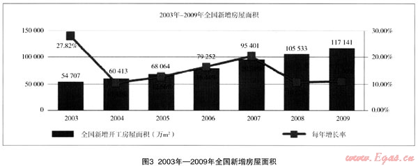 燃氣表業(yè)務(wù)與房產(chǎn)市場發(fā)展密切相關(guān)。2003年—2009年建筑房屋施工面積由259377萬m2增加到588593萬m2,年均增長14.6%。