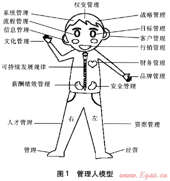 現(xiàn)代市場(chǎng)經(jīng)濟(jì)下的企業(yè)管理,就是帶有知識(shí)經(jīng)濟(jì)、網(wǎng)絡(luò)經(jīng)濟(jì)、信息經(jīng)濟(jì)色彩的企業(yè)管理,就是對(duì)技術(shù)、信息的把握,帶有中西方文化大融合特色對(duì)人的管理。各種管理理論都是管理學(xué)家站在不同角度,用不同語(yǔ)言解讀企業(yè)可持續(xù)發(fā)展規(guī)律的不同層次。而管理人模型(見(jiàn)圖1)就是以人為模板,按照人的幾大系統(tǒng)相互協(xié)作,以人的大腦指揮著兩只腳向目標(biāo)前進(jìn)為基礎(chǔ)。確立“一個(gè)腦袋兩只腳”的管理人模型,就是具有戰(zhàn)略思維的“大腦”,指揮著圍繞市場(chǎng)活動(dòng)的“經(jīng)營(yíng)左腳”,圍繞企業(yè)內(nèi)部的“管理右腳”,帶動(dòng)企業(yè)這個(gè)法人不停地向前走。
