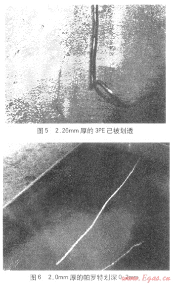 國內外法定檢驗機構的檢測結果表明,雙層環(huán)氧聚合物混凝土結構涂層具有比3PE更優(yōu)異的耐劃傷性(圖5、6)、耐磨損性,其補口處與管體同高,還與陰極保護系統(tǒng)有很好的匹配性。帕羅特已被美國定向穿越工程承包協(xié)會DC CA(Directional Crossing Contractors Association)指定為定向穿越覆蓋層專用保護產品。