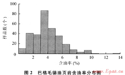 共分析含油率樣品459件,對356個(gè)含油率大于1.5%的樣品統(tǒng)計(jì),含油率平均值為3.9%;對179個(gè)含油率大于3.5%的樣品統(tǒng)計(jì),平均含油率為5.3%??梢哉J(rèn)為本區(qū)油頁巖含油率為3.9%~5.3%,為中-低含油率油頁巖。從本區(qū)含油率的概率分布圖(圖2)可以看出,峰值主要出現(xiàn)在4%~5%,說明該區(qū)絕大多數(shù)油頁巖含油率偏低,只有少數(shù)的高含油率層位或樣品出現(xiàn)。
