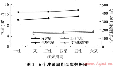 3) 由于庫(kù)內(nèi)含氣孔隙體積上升,使氣庫(kù)總體運(yùn)行效率得以提高,庫(kù)容量、工作氣量和氣墊氣量都逐步提高,其中第六采氣周期末工作氣量比第二采氣周期末上升約14%。