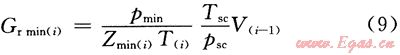 采氣末氣墊氣量計(jì)算模型的建立是以上一注氣周期末孔隙體積[V(i-1)]變化為依據(jù)(式7),再利用氣體狀態(tài)方程進(jìn)一步計(jì)算本采氣周期末對(duì)應(yīng)下限壓力時(shí)的氣墊氣量[Gr min(i)]。數(shù)學(xué)表達(dá)式為: