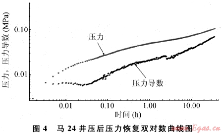 在馬24井為代表的壓后壓力雙對數(shù)曲線上,壓力與壓力導數(shù)成鐵軌狀,水力裂縫特征明顯,說明壓后在地層中形成了主裂縫(圖4)。