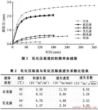 1) 乳化壓裂液在合適的配方和助排措施下防膨效率高、濾失小,排液效率高,對地層傷害小,與低壓、強水敏地層具有較好的適應性。