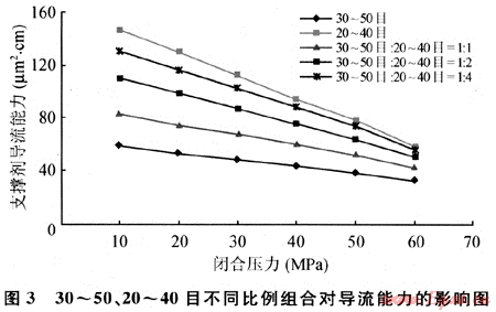 針對地應力高、地層濾失大、裂縫寬度小的特點,通過室內(nèi)30~50目和20~40目陶粒組合導流能力實驗表明,30~50目和20~40目陶粒以1:4組合加入,不會顯著影響導流能力(導流能力降低小于10.0%),而可以以小粒徑陶粒填充窄裂縫,待形成一定寬度后再加入20~40目陶粒,可以提高施工成功率(圖3)。