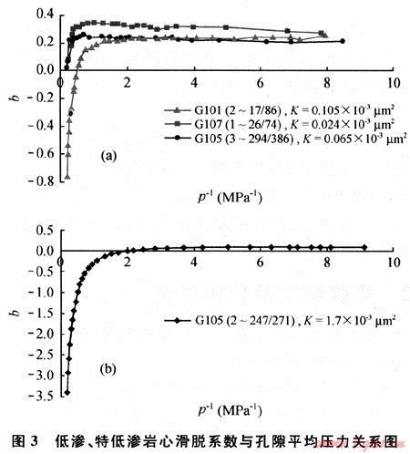 由此可知,低滲巖心氣體滲流過程中滑脫效應并不是一定存在,而且滑脫系數(shù)也并不是一個常數(shù),在低孔隙壓力條件下,滑脫系數(shù)可以認為是一個常數(shù),但是隨孔隙壓力增加,滑脫系數(shù)開始減?。欢覞B透率越大,滑脫系數(shù)越小,滑脫效應越不明顯;對于特低滲巖心,滑脫系數(shù)明顯偏大,而且在高孔隙壓力下滑脫系數(shù)雖有所減小,但是變化不是太大,一般不會變?yōu)樨撝怠Uf明氣體滑脫效應確實主要發(fā)生在低孔隙壓力下的低滲透巖石中。較高滲透巖石中雖然也存在滑脫效應,但是隨壓力增加,滑脫效應迅速減小直至可以忽略。
