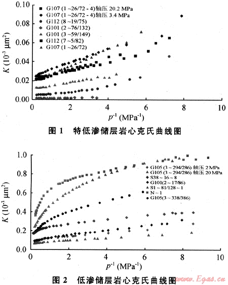 圖1、2是不同滲透率儲層單相氣體滲流典型特征曲線。圖1是特低滲透率(K<0.1×10-3μm2)儲層巖心克氏曲線的綜合表現(xiàn),氣體的滲流特征基本符合克氏滲流曲線特征,克氏滲流規(guī)律表達式為[4~5]: