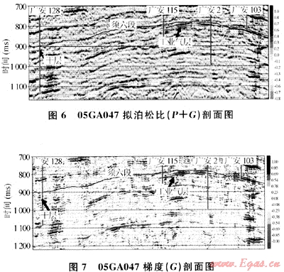 通過(guò)實(shí)際資料的AVO屬性剖面反演與鉆井結(jié)果的綜合分析對(duì)比,認(rèn)識(shí)到在上述5種AVO屬性剖面中,擬泊松比剖面(P+G)和梯度剖面(G)能很好地指示須六段儲(chǔ)層的含氣性,含氣處都表現(xiàn)為強(qiáng)振幅,且反演結(jié)果與實(shí)際鉆井結(jié)果非常吻合(見(jiàn)圖6、7),該方法是AVO疊前道集分析和近遠(yuǎn)道疊加剖面對(duì)比氣層預(yù)測(cè)方法的有效補(bǔ)充,可以進(jìn)一步提高須六段氣層的預(yù)測(cè)精度。