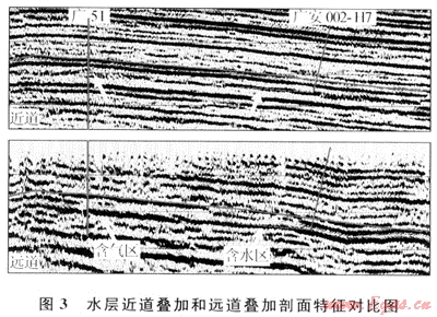 圖3是過(guò)廣51(工業(yè)氣井)和廣安002-H7(水井)的一條近道和遠(yuǎn)道疊加剖面對(duì)比圖,從圖中看出,須六段氣層底的反射在遠(yuǎn)道疊加剖面上的振幅明顯比近道疊加剖面振幅強(qiáng),近道疊加剖面主要表現(xiàn)為中-中弱振幅、較連續(xù),而遠(yuǎn)道振幅較強(qiáng),但橫向上振幅強(qiáng)弱變化明顯,有時(shí)呈低頻、復(fù)波特征;反射軸時(shí)常出現(xiàn)上下起伏、零亂等反射特征。水層在近道疊加剖面和遠(yuǎn)道疊加剖面上反射振幅都較強(qiáng),同相軸較光滑,呈高頻、連續(xù)特征,遠(yuǎn)道疊加剖面的反射振幅比近道略有增強(qiáng),但與氣層相比,不明顯。