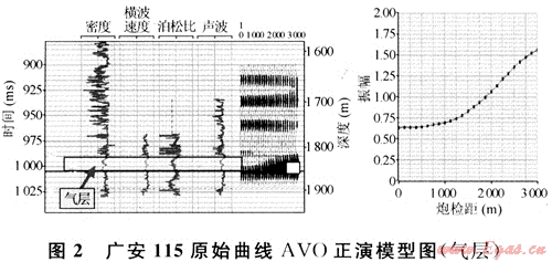 圖2為廣安115井原始曲線(xiàn)AVO正演模型,目的層為須六段1828~1840m、1843~1953.5m為工業(yè)氣層,左圖分別是測(cè)井實(shí)測(cè)的密度、橫波速度、泊松比和聲波4條曲線(xiàn)和采用Zoepprittz方程計(jì)算出的中心點(diǎn)道集,右圖中虛線(xiàn)是合成道集上拾取的反射振幅隨炮檢距的變化關(guān)系,從圖中可以看出,須六段氣層的AVO響應(yīng)特征非常明顯,在共中心點(diǎn)道集上氣層的反射振幅隨炮檢距的增大明顯增強(qiáng)。