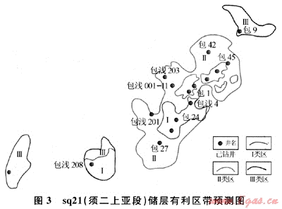 在對(duì)sq21(須二上亞段)進(jìn)行儲(chǔ)層分類(lèi)評(píng)價(jià)時(shí),以儲(chǔ)能系數(shù)大于1、0.5~1、小于0.5分布作為Ⅰ、Ⅱ、Ⅲ儲(chǔ)層的分類(lèi)依據(jù),以區(qū)塊內(nèi)是否有獲得工業(yè)油氣流井作為分類(lèi)的劃分標(biāo)準(zhǔn)。Ⅰ類(lèi)有利區(qū)位于鼻狀構(gòu)造上,儲(chǔ)層發(fā)育好,儲(chǔ)能系數(shù)大于1,且有工業(yè)氣流井;Ⅱ類(lèi)有利區(qū)位于鼻狀構(gòu)造上,儲(chǔ)層發(fā)育較好,儲(chǔ)能系數(shù)為0.5~1,且有工業(yè)氣流井;Ⅲ類(lèi)有利區(qū)位于鼻狀構(gòu)造之外,但儲(chǔ)層較發(fā)育,儲(chǔ)能系數(shù)在0.5~1。綜合評(píng)價(jià)出Ⅰ類(lèi)有利區(qū)4個(gè),Ⅱ類(lèi)有利區(qū)2個(gè),Ⅲ類(lèi)有利區(qū)3個(gè)。Ⅰ類(lèi)有利區(qū)塊位子包22井-包24井-包淺4井區(qū)、包21-包1-包淺001-6井區(qū)、包33井-包16井-包45井井區(qū)、包淺208井區(qū);Ⅱ類(lèi)較有利區(qū)塊位于包淺201-包27井區(qū)、包淺203-包淺001-11井區(qū)、包42井區(qū)(圖3)。