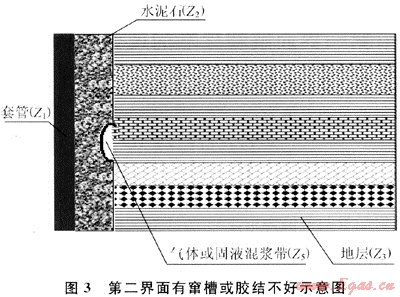 如圖3所示,當(dāng)?shù)诙缑婺z結(jié)質(zhì)量較差時(shí),與前面對(duì)第一界面膠結(jié)不好的分析類似,水泥環(huán)與地層之間存在第三介質(zhì),第三介質(zhì)一般反映為氣體、液體或固液混漿。
