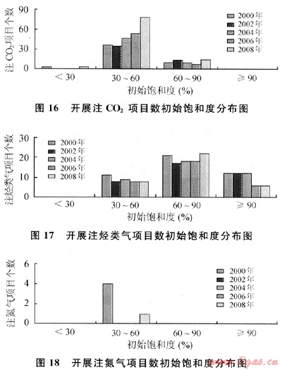 從圖16~18中可以看出,近10a來世界范圍內(nèi)實施的注氣項目中,采用CO2,驅(qū)及氮氣驅(qū)的油藏初始飽和度取值范圍為30%~60%,注烴類氣為30%~90%。