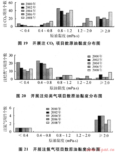 從圖19~21中可以看出:在成功進行注CO2選擇原油黏度在0.80~1.20mPa·s范圍內(nèi)的油藏最多;在成功進行注烴類氣選擇原油黏度小于0.80mPa·s的油藏最多;在成功進行注氮氣的項目中,選擇原油黏度范圍要么較小(小于0.4mPa·s)要么較大(大于2mPa·s)。