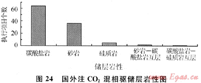 隨著全球?qū)O2排放引起大氣污染的日益重視,注CO2資源化利用潛力越來越大,其項目占了絕大部分。在我國開展了很多注CO2的吞吐項目,部分CO2驅(qū)也在實施。國家也很重視CO2排放及資源利用,專門批準“973”項目“溫室氣體提高石油采收率的資源化利用及地下埋存”,還設(shè)置了國家重大專項和“863”重點項目,對CO2埋存及資源化利用的各個方面進行了全面研究。但我國目前大多數(shù)項目都未實現(xiàn)CO2混相驅(qū)。對國外2008~2009年注CO2混相驅(qū)的108個項目進行統(tǒng)計,表明國外注CO2混相驅(qū)原油黏度主要分布在0.8~1.2mPa·s,溫度主要分布在30~60℃,儲層深度在600~2000m的較多,碳酸鹽巖注氣滲透率主要在(0.1~10)×10-3μm2及(10~50)×10-3μm2范圍內(nèi),砂巖中注CO2是滲透率大于10×10-3μm2的油藏??梢妵庵饕菍μ妓猁}巖油藏進行混相驅(qū)(圖24)。當然其原油組成對混相壓力影響也較大,但由于沒有公布的數(shù)據(jù),因此這里未列出[9~10]。