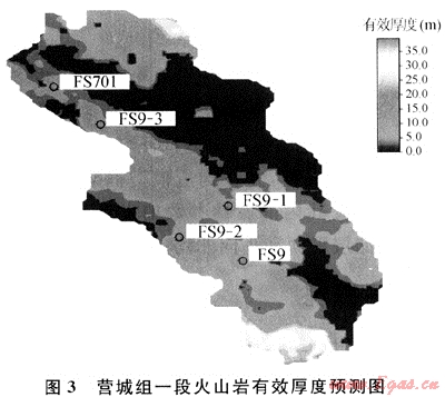 3) 屬性模型。研究區(qū)屬性建模采用測井曲線生成法,利用井筒巖石密度曲線數(shù)據(jù)建立密度模型[4]。由于火山巖與圍巖的區(qū)分十分復雜,單一屬性不能很好描述儲層分布[5],所以采用巖石密度和伽馬曲線這兩種對火山巖儲層較敏感參數(shù)進行建模,所以本區(qū)建立了密度和伽馬模型,并根據(jù)有效厚度劃分標準,預測了營城組一段有效厚度分布。本次建模過程中將密度曲線粗化后,進行變差函數(shù)分析,正確的變異函數(shù)估計要求對采樣方式、均值變化或樣品承載大小以及變異函數(shù)對方位變化的敏感性作出全面的評價。然后用密度反演體作為協(xié)變量,進行10次隨機實現(xiàn)[6~7]。圖2為通過昌德氣田的密度屬性模型得出的營一段儲層厚度預測圖,F(xiàn)S9區(qū)塊發(fā)育一個經過FS701、FS9-1、FS9井的北西向火山巖條帶。