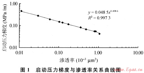 經對11塊全直徑巖樣的室內實驗表明,儲層滲透率對啟動壓力梯度[3]有明顯的影響,隨著巖石空氣滲透率的降低,啟動壓力梯度增大(圖1)。