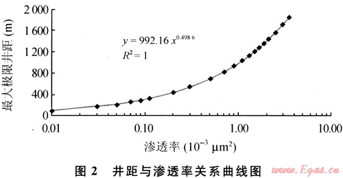 統(tǒng)計分析下白堊統(tǒng)營城組三段160塊氣層巖心分析數據,平均孔隙度10.2%,空氣滲透率1.117×10-3μm2,對應的啟動壓力梯度為0.0459MPa/m,由此推算,到氣田廢棄時,最大泄氣半徑為524m,對應的平均最大極限井距為1048m(圖2)??紤]Ⅱ、Ⅲ類儲層天然裂縫較發(fā)育,因此以發(fā)育Ⅱ、Ⅲ類儲層為主的井區(qū),沿天然裂縫發(fā)育方向平均井距大于1048m。