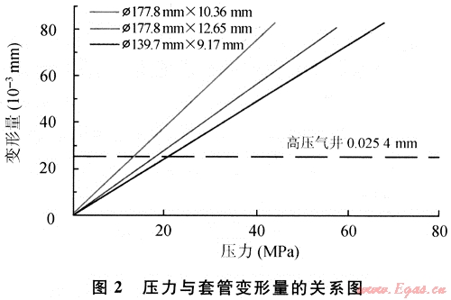 根據(jù)式(5)可計(jì)算套管的變形值。計(jì)算出的變形值是套管膨脹變形值,而在水泥凝固后釋放內(nèi)壓,套管收縮回原尺寸,此膨脹變形就變?yōu)樘坠芘c水泥膠結(jié)被破壞而形成微環(huán)隙。從式(5)可知:①套管尺寸越大,相同壓差下,產(chǎn)生的微環(huán)隙越大;②套管尺寸相同,壁厚越薄,產(chǎn)生的微環(huán)隙愈大;③對于固定套管而言,微環(huán)隙大小與受的壓差成正比。通過施加外擠壓力使套管具備彈性能,在水泥漿候凝發(fā)生徑向體積收縮時(shí),通過釋放彈性能,彌補(bǔ)體積收縮產(chǎn)生的微環(huán)隙,消除氣竄通道,從而提高固井質(zhì)量。
