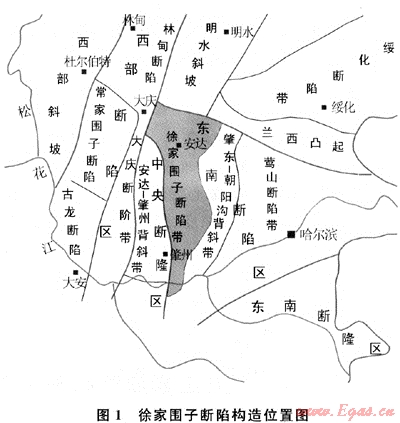 徐家圍子斷陷位于松遼盆地古中央隆起帶東部,面積約5350km2,斷陷在晚侏羅世-早白堊世早期形成。斷陷西部為斷階帶,中部為深洼帶,東部為斜坡帶。西側(cè)與古中央隆起帶結(jié)合部為一大型的基底斷裂面,該斷裂面高差為3000~5000m,寬6~13km。斷陷向東逐步抬升進入肇東-朝陽溝隆起帶(圖1)。