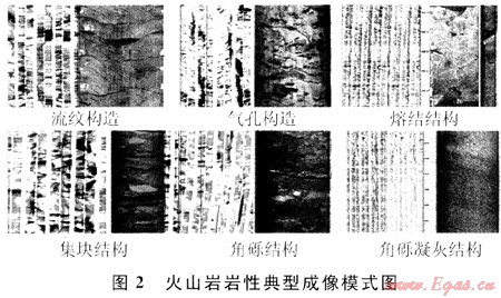 徐深氣田火山巖巖性成因復(fù)雜,即使巖石化學成分相同,但如果結(jié)構(gòu)、構(gòu)造不同,其巖石類型也會不同。而應(yīng)用交會圖版法雖然可以識別成分不同的巖性(如酸性巖、中性巖和基性巖等),但對于成分相同、而結(jié)構(gòu)或構(gòu)造不同的巖性如流紋質(zhì)熔結(jié)凝灰?guī)r、角礫凝灰?guī)r、火山集塊巖、火山角礫巖這些火山巖巖性識別效果較差,對這類巖性必須結(jié)合成像測井進行識別。圖2為火山巖典型成像模式圖。