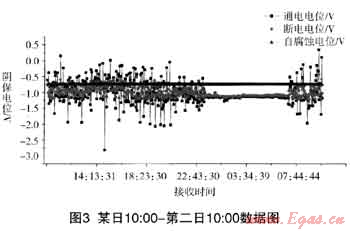 比較通電電位、斷電電位及自然腐蝕電位可見,在干擾嚴(yán)重時(shí)間段,通電電位變化幅度大于斷電電位變化幅度,這是由于通電電位中包含雜散電流造成的IR降的影響,變化幅度從理論上要大于斷電電位。由于自然電位的試片不與管道電連接,因此,其不受管道中流入流出雜散電流的干擾,電位穩(wěn)定。有了自然電位,不僅可以用-850mV CuS04極化電位準(zhǔn)則判定,而且可以利用1OOmV極化偏移準(zhǔn)則對(duì)保護(hù)效果進(jìn)行判斷陰極保護(hù)效果。通過以上各個(gè)不同時(shí)期的數(shù)據(jù)分析可以看到,無線遠(yuǎn)程傳輸系統(tǒng)可以比較穩(wěn)定的監(jiān)測(cè)1天24h之內(nèi)的自然電位、通電電位和斷電電位的變化,對(duì)管線安全穩(wěn)定運(yùn)行提供了科學(xué)的管理依據(jù)。