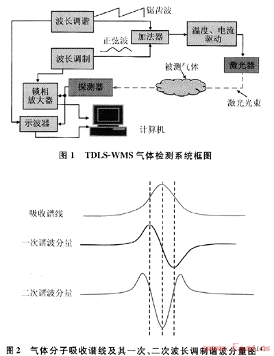 技術(shù),其系統(tǒng)框圖見圖1。圖1中采用加法器將高頻正弦調(diào)制信號(hào)同低頻調(diào)諧信號(hào)結(jié)合起來,作為激光器的驅(qū)動(dòng)電流,在光電探測(cè)器將氣體吸收之后的光信號(hào)轉(zhuǎn)變?yōu)殡娦盘?hào)輸出并用鎖相放大器進(jìn)行相敏檢波,從而獲得被測(cè)氣體吸收譜線的諧波分量。圖2為氣體分子吸收譜線及其一次、二次波長(zhǎng)調(diào)制諧波分量的示意圖。
