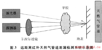 激光器輸出的1650nm的激光(甲烷氣體在1650nm附近存在強(qiáng)吸收譜線)經(jīng)過放大功率為1W的拉曼放大器放大后,照射在地表上,地表附近泄漏出的甲烷氣團(tuán)對(duì)激光吸收后,剩余的激光照射在陸地表面,經(jīng)反射、散射之后的激光再次通過甲烷氣團(tuán),然后通過一個(gè)大的菲涅爾透鏡會(huì)聚到光電探測(cè)器上。該系統(tǒng)在100~150m的探測(cè)范圍內(nèi)可以獲得71.4mg/m3的探測(cè)靈敏度,系統(tǒng)信噪比大于3[5]。能夠?qū)崿F(xiàn)復(fù)雜環(huán)境下天然氣輸送管道泄漏的高靈敏度檢測(cè)。英國(guó)蘇格蘭天然氣管道系統(tǒng)采用上述方法進(jìn)行天然氣泄漏檢測(cè),但是此項(xiàng)技術(shù)目前在我國(guó)還沒有正式的應(yīng)用。