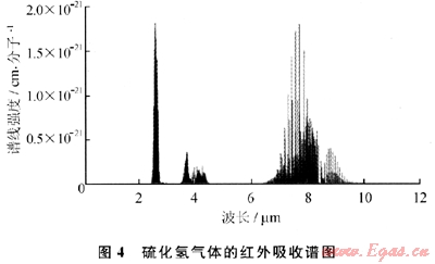 現(xiàn)有的硫化氫檢測(cè)多采用化學(xué)方法,需要將儀器放在硫化氫氣體中或者對(duì)環(huán)境中的氣體進(jìn)行采樣來分析其濃度,既無法保證實(shí)時(shí)監(jiān)測(cè),同時(shí)威脅到檢測(cè)人員的安全。而遠(yuǎn)距離紅外甲烷檢測(cè)技術(shù)同樣可以用在對(duì)硫化氫的遠(yuǎn)距離實(shí)時(shí)探測(cè)上。從HITRAN 2008[1]氣體分子紅外吸收光譜數(shù)據(jù)庫(kù)可以知道,硫化氫在2.6μm和7.7μm附近有較強(qiáng)的吸收帶,在4μm處有相對(duì)較弱的吸收譜(圖4)。在空氣中檢測(cè)隨天然氣泄漏的硫化氫氣體,首先要克服空氣中的水蒸氣和殘余的甲烷氣體的干擾。水蒸氣在2.6μm處存在強(qiáng)吸收譜,同時(shí)甲烷在7.65μm也存在比硫化氫吸收強(qiáng)度大幾十倍的吸收譜線。