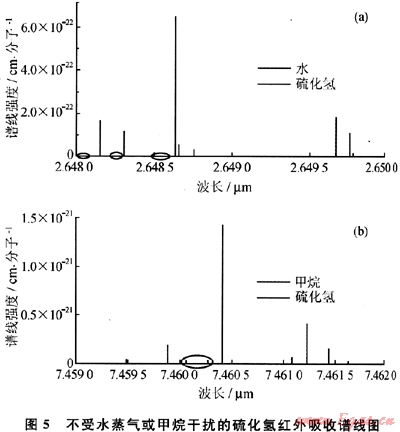 對(duì)泄漏在空氣中的硫化氫氣體進(jìn)行遠(yuǎn)距離檢測(cè),空氣中殘留的甲烷、水蒸氣的干擾不可忽略。紅外光譜是分子振動(dòng)轉(zhuǎn)動(dòng)的特征譜線,不同分子因?yàn)榛瘜W(xué)鍵的不同,具有不同波長(zhǎng)的吸收譜。同時(shí)氣體分子的吸收光譜并不是連續(xù)分布的,而是在一個(gè)波長(zhǎng)范圍里離散的存在。譜線的寬度受到壓力的影響而有不同程度的展寬,在不同的壓力下具有高斯、Voigt或者洛倫茲分布。氣體分子的吸收譜線之間可以因?yàn)橄嘟嬖诮化B,或者由于分布較遠(yuǎn)而留有空白區(qū)。因此,通過詳細(xì)分析水蒸氣、甲烷、硫化氫氣體在不同波長(zhǎng)下吸收譜線之間的交疊情況,來選擇不受或者受水蒸氣、甲烷吸收譜線影響較小的硫化氫吸收譜線,并以此來進(jìn)行檢測(cè),從而確定出所要采用的光源波長(zhǎng)、類型以及檢測(cè)方法等。圖5給出了根據(jù)HITRAN 2008分子光譜數(shù)據(jù)庫(kù)對(duì)硫化氫、水蒸氣和甲烷分子吸收譜線進(jìn)行分析之后選定的硫化氫吸收譜線,圈中的譜線為硫化氫吸收譜線附近的弱吸收強(qiáng)度的水蒸氣或甲烷吸收譜線。從圖5可以看出,硫化氫在2.64μm(圖5-a)和7.46μm(圖5-b)附近能夠得到不受水蒸氣或甲烷明顯干擾的吸收譜線,用來實(shí)現(xiàn)紅外硫化氫檢測(cè)。