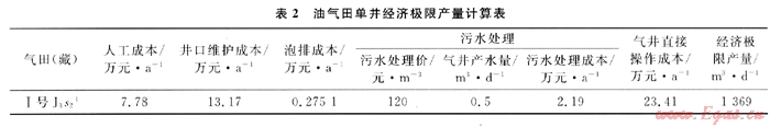 選用Ⅰ號氣田實際生產(chǎn)中發(fā)生的平均成本計算經(jīng)濟(jì)極限產(chǎn)量,氣井直接操作成本見表2。經(jīng)計算,氣井的經(jīng)濟(jì)極限產(chǎn)量(廢棄產(chǎn)量)為1369m3/d(表2)。根據(jù)廢棄產(chǎn)量和氣井的遞減率可以確定氣井的生產(chǎn)年限,并由此確定開發(fā)井生產(chǎn)評價期。