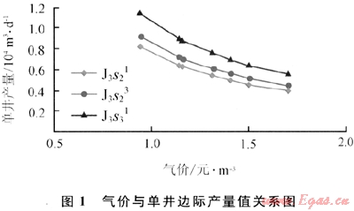根據(jù)上面研究計算的Ⅰ號氣田3個不同埋深氣藏J3s21(2300m)、J3s23(2450m)、J3s31(2600m)氣價與單井邊際產(chǎn)量值的關(guān)系,通過歸納分析,可知隨著氣價上漲單井產(chǎn)量界限值呈冪指數(shù)遞減,當(dāng)氣價小于1.5元/m3時單井產(chǎn)量界限值遞減較快;當(dāng)氣價大于等于1.5元/m3時趨于平穩(wěn)(見圖1),說明氣價對難動用儲量的動用影響較大。