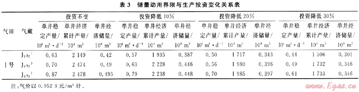 儲量動用的技術(shù)界限值(邊際值)不但與油氣價敏感,而且與投資成本也密切相關(guān)。在一定的范同內(nèi)適當(dāng)降低生產(chǎn)投資費用,利于難動用儲量開發(fā)經(jīng)濟(jì)效益的提高。表3為研究選用的Ⅰ號氣田儲量動用界限與生產(chǎn)投資變化關(guān)系表,由表3可算出投資降低20%時,儲量動用邊際值降低20%~22%。而當(dāng)氣價由0.9523元/m3上浮至1.143元/m3(也上浮20%時),儲量動用邊際值降低16%~17%,相比之下儲量動用的技術(shù)界限值與投資成本更敏感。因此,在分析難動用儲量的可動用性時是應(yīng)該油氣價格和投資兩方面的經(jīng)濟(jì)因素都要考慮。
