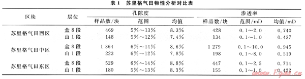 蘇里格氣田主力層二疊系盒8段、山1段儲層形成于沖積背景下的河流沉積體系,河道內(nèi)部結(jié)構(gòu)復雜,隔夾層發(fā)育,非均質(zhì)很強。對氣田范圍內(nèi)93口取心井氣層段巖心分析進行統(tǒng)計,結(jié)果表明:孔隙度主要范圍在5%~12%之間,平均值為8.69%;滲透率主要范同為0.1~2mD,平均為0.733mD。各區(qū)塊之間存在一定差異,中區(qū)總體上好于西區(qū)和東區(qū)(表1)。