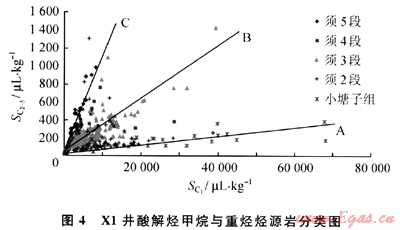 據(jù)此X1井須5段烴源巖以C類為主;須4段以C類、B類為主;須3段以8類為主,少部分偏C類和A類;須2段以A類為主,少部分偏C類和B類;小塘子組以A類為主,見圖4(圖中SC2~5表示酸解烴重?zé)N含量)。