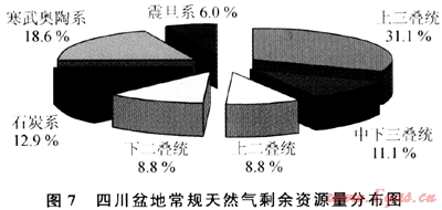 四川盆地天然氣資源豐富,盆地天然氣資源量為10.6×1012m3,按盆地現(xiàn)有探明儲量計算,探明率僅19.5%。隨著新技術(shù)推廣應(yīng)用和認(rèn)識深化,盆地二疊系長興組、三疊系飛仙關(guān)組礁灘以及三疊系須家河組勘探相繼獲得重大突破,資源量還將有較大增長,資源潛力很大。從待發(fā)現(xiàn)資源分布來看,以上三疊統(tǒng)為最多,占31.1%;其次為中下三疊統(tǒng)-上二疊統(tǒng),占19.9%(圖7)。此外,四川南部地區(qū)下古生界海相頁巖氣資源豐富,初步估算寒武系筇竹寺組和志留系龍馬溪組頁巖氣資源量在4×1012m3以上。這些領(lǐng)域都是四川盆地下一步勘探開發(fā)的重點,也是盆地天然氣持續(xù)上產(chǎn)的重要方向。