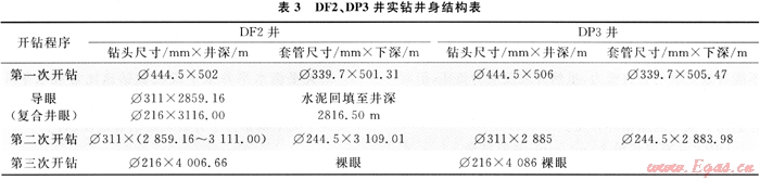DF2、DP3井采用第三次開鉆井身結(jié)構(gòu),Φ339.7mm表套進入中下侏羅統(tǒng)直羅組,封住上部膠結(jié)強度低、疏松、易垮塌地層,第二次開鉆采用Φ311mm鉆頭,下入Φ244.5mm技術(shù)套管封住造斜段。第三次開鉆采用Φ215.6mm鉆頭,為下步完井方式的選擇留有余地,如果獲得理想的自然產(chǎn)能則裸眼完井,若自然產(chǎn)能低先進行氣舉、解堵,解堵后仍不能達到配產(chǎn)要求,可以下5½″尾管射孔完井,對儲層實施壓裂改造[5]。這樣既降低了施工風險,又避免了小井眼中實施壓裂改造在工具上的局限性。鉆井實踐結(jié)果表明,這種井身結(jié)構(gòu)是合理的,其結(jié)構(gòu)簡單、施工方便,具有可操作性和經(jīng)濟性。DF2、DP3井實鉆井身結(jié)構(gòu)如表3所示。