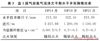 2009年先后針對(duì)大牛地氣田的盒1段氣層在DP14井、DP19井和DP22井開展了氮?dú)馀菽菲胶忏@水平井的現(xiàn)場(chǎng)試驗(yàn),在儲(chǔ)層保護(hù)、油氣發(fā)現(xiàn)、自然建產(chǎn)和提高鉆井速度方面取得了顯著效果,表3給出了盒1段氣層氮?dú)馀菽菲胶馑骄畬?shí)施情況。